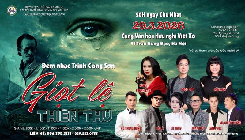 Vào 20h00 ngày 29.3, tại Cung Văn hóa Hữu nghị Việt Xô – Hà Nội, đêm nhạc “Giọt lệ thiên thu” sẽ diễn ra như một lời tri ân sâu lắng tưởng nhớ 25 năm ngày nhạc sĩ Trịnh Công Sơn rời xa “cõi tạm”.